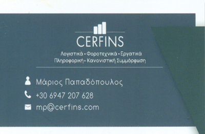 customer tabsΕπικοινωνίαΛογιστικές, Τεχνολογικές & Συμβουλευτικές Υπηρεσίες.Η εταιρεία Cerfins διαθέτει σημαντική εμπειρία στους χώρους των οικονομολογικών υπηρεσιών (λογιστικά, φοροτεχνικά, εργατικά, μισθοδοσία, διαχείριση επενδυτικών προγραμμάτων), ασφαλιστικών υπηρεσιών, καθώς και της μελέτης, εφαρμογής, συντήρησης & πιστοποίησης τεχνικών φακέλων CE και συστημάτων βάσει διεθνών προτύπων ISO στους τομείς διαχείρισης ποιότητας (ISO 9001), ασφάλειας πληροφοριών (ISO 27001), περιβαλλοντικής διαχείρισης (ISO 14000, EMAS), υγιεινής & ασφάλειας εργαζομένων (ISO 18000) και ασφάλειας τροφίμων (αυτοέλεγχος HACCP, ISO 22000).Ο συνδυασμός των συμπληρωματικών αυτών υπηρεσιών στους χώρους των οικονομικών, της πιστοποίησης συστημάτων και των ασφαλιστικών υπηρεσιών, στοχεύει στην ολοκληρωμένη θωράκιση των επιχειρήσεων απέναντι στις προκλήσεις της εγχώριας και διεθνούς αγοράς, καθώς και στην πλήρη κάλυψη των λογιστικών και ασφαλιστικών αναγκών για επαγγελματίες & ιδιώτες.Λογιστικές- Φοροτεχνικές ΥπηρεσίεςΥπηρεσίεςΣουλίου 47, Αγία ΠαρασκευήΦλέμινγκ 1, Ραφήνα 2111152937 2294024124 6943108147ops@cerfins.comwww.cerfins.comCerfins Το προτείνω (έχει προταθεί 1 φορές) ΦωτογραφίεςFacebook LikeShare on FacebookTweet Widget